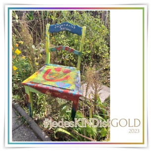 Daher möchte ich zum Wesentlichen kommen: Das Kunstprojekt "Goldener Regenbogenstuhl" symbolisiert für mich den Weltfrieden. Jeder einzelne, in den Farben des Regenbogens gestaltete Stuhl stellt für mich ein kleines, kunstvolles Symbol des Weltfriedens dar. Wenn der Stuhl schließlich mit dem Namen des Kindes liebevoll signiert ist, berührt mich dieser Anblick tief und erfüllt mich mit Freude.