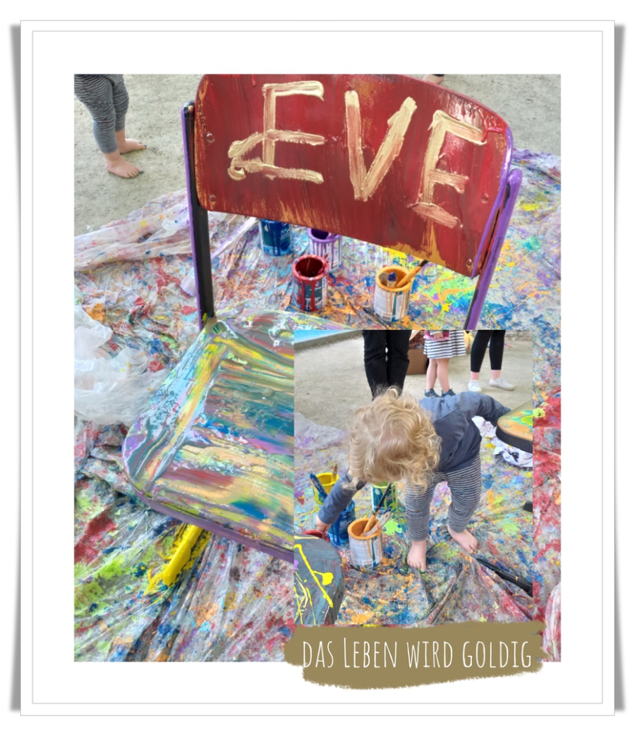Der gesamte kreative Prozess des Kunstprojekts "Goldener Regenbogenstuhl" ist ein Geschenk für das Kind, das eigenständig seinen oder ihren "Goldenen Regenbogenstuhl" künstlerisch gestaltet. Mit der Vollendung wird das Werk den Namen des Kindes tragen. Alternativ könnte man auch darüber nachdenken, dass die Farben des Regenbogens den Namen des Kindes auf eine bezaubernde Weise zum Strahlen bringen. Was für eine beeindruckende und liebevolle Würdigung, dass ein Kind erfährt!